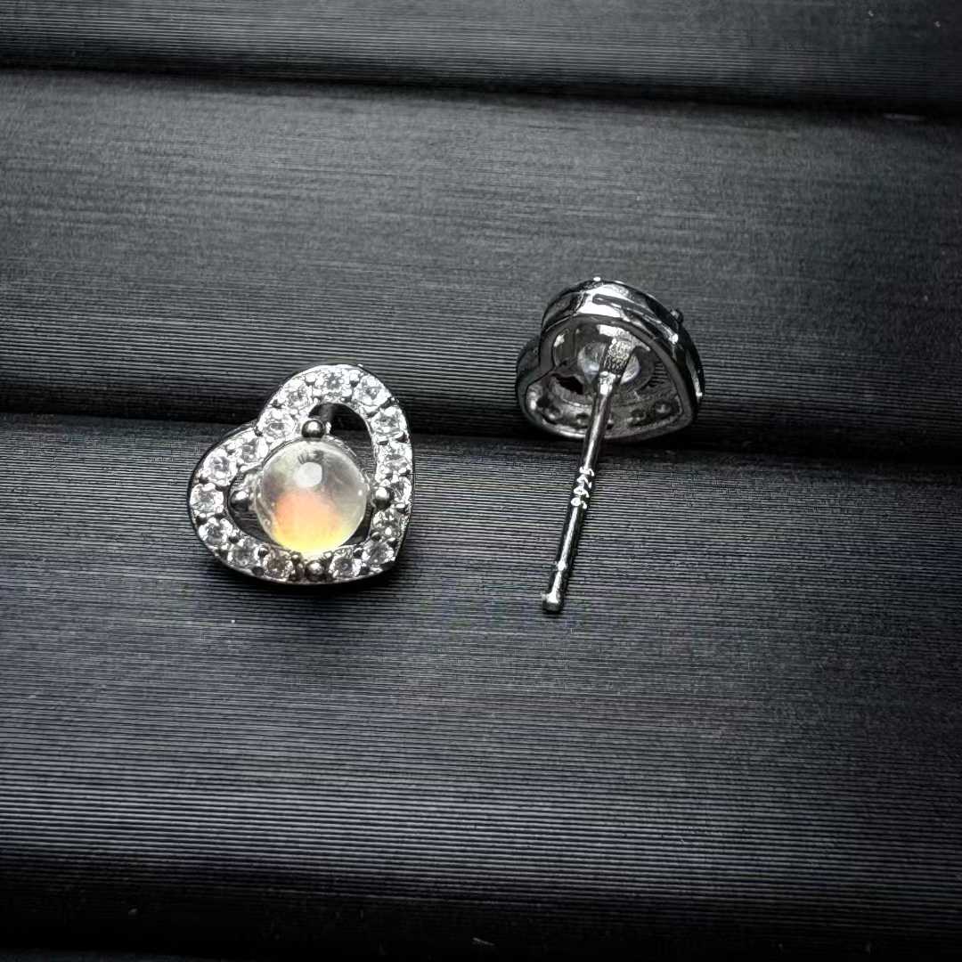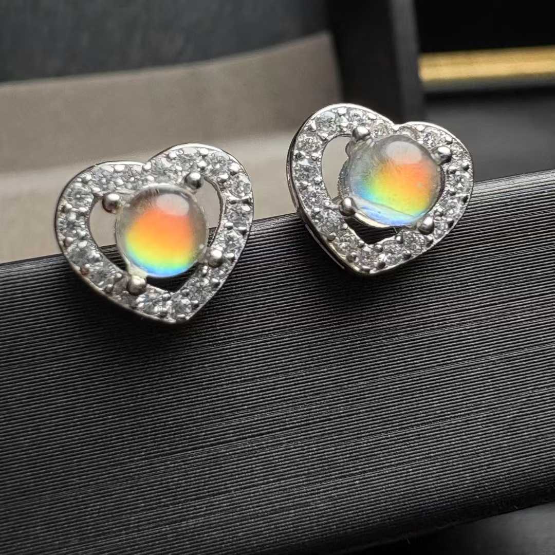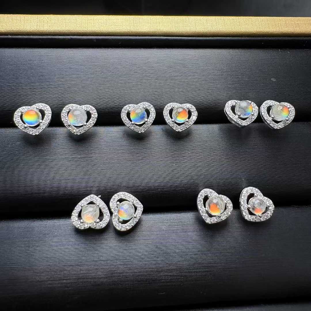 Natural Madagascar Rainbow Moonstone Heart Stud Earrings (S925 Silver Setting) -|Bulk Price