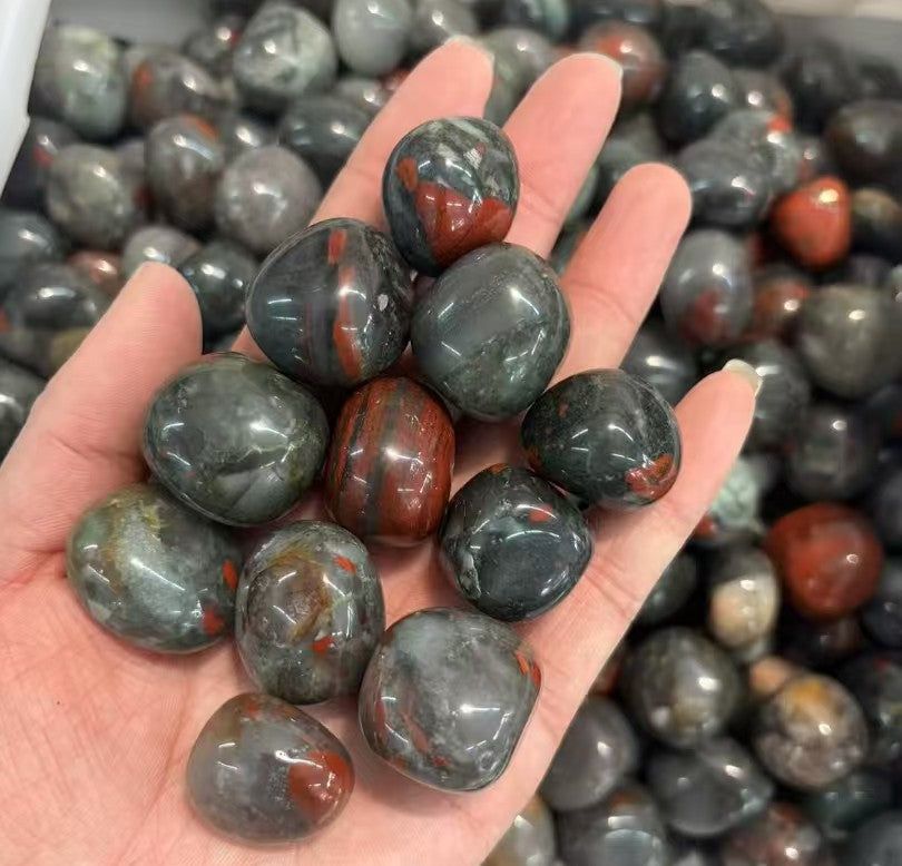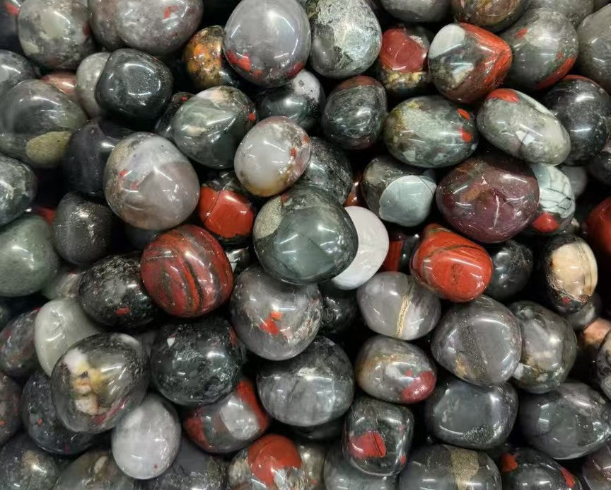 Harness the primal power of African Bloodstone – a striking deep green chalcedony with vivid red iron oxide "blood" speckles. Our **20-30mm hand-polished stones** are revered for grounding courage, deflecting negativity, and revitalizing life force.